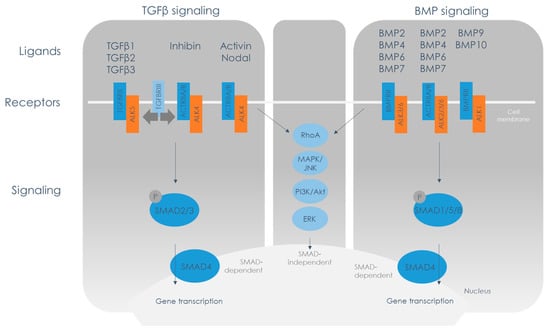 Of course, there are exceptions to the general division in a TGFβ and a BMP cluster; in some cases, BMPs can induce SMAD2/3 phosphorylation or TGFβ can induce SMAD1/5/8 phosphorylation [,]. This can be due to an aberrant composition of type I receptors in the heterotetrameric complex, e.g., TGFβ ligand can initiate SMAD1/5/8 phosphorylation when the type I receptor complex consists of a heterodimer of ALK5 and ALK1 []. This cross-phosphorylation can be due to the presence of TGFβ type III receptors in the receptor complex. These accessory receptors have a transmembrane domain, similar to the type II receptors, but lack the intracellular kinase domain that is essential for activation of the type I receptor. Type III receptors are therefore not able to initiate signaling themselves, but can modulate signaling by type II receptors.