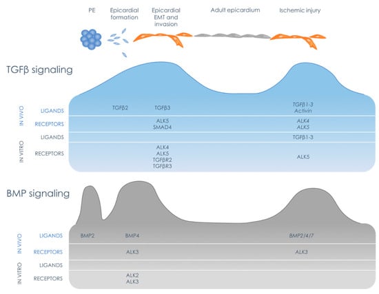 As schematically shown in Figure 1, the other side of the TGFβ family consists of the BMP pathway that can be activated by BMPs and signals via SMAD1/5/8. While initially known for its ability to induce bone formation [], BMP signaling emerged as a central regulator of several important processes during development and disease. In the context of cardiac development, the BMP pathway is involved in the specification of the epicardial lineage in the pro-epicardium. The ratio between BMP2 and FGF2 expression was shown to determine if the pro-epicardial cell differentiates towards the myocardial lineage, in case of high levels of BMP2, or the epicardial lineage, in case of high levels of FGF2 []. When directed towards the epicardial cell lineage, pro-epicardial cells migrate towards the heart. To be able to do this, pro-epicardial cells are thought to undergo EMT in order to migrate towards the heart and form the epicardium. Interestingly, pro-epicardial EMT is regulated via the type I receptor ALK2, suggesting a potentially different mechanism in pro-epicardial EMT compared to epicardial EMT which is mainly regulated via ALK5 [].
