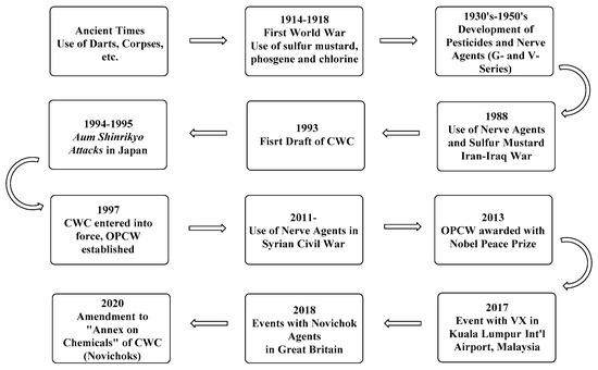 Although many papers have dealt with chemical warfare over the years, the use of CW is currently a pressing subject. Recently, chemical warfare agents have made headlines due to their alleged deployment in the Civil War ongoing in Syria (2011–) and as means of murdering the North Korean national Kim Jun Nam at the Kuala Lumpur International Airport in 2017. A report from Malaysian authorities confirmed that VX was used by the perpetrators [4,23,24,25,26,27,28,29,30,31,32,33,34,35,36,37,38,39,40,41,42].