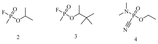 After WWI and more actively during WWII, while looking for new pesticides, German scientists developed a series of pentavalent phosphorus compounds that contained a leaving group such as a halogen. They discovered that these compounds were very toxic, and capable of inhibiting acetylcholinesterase (AChE). These findings resulted in the weaponization of the first nerve agents, called also G-agents, which included sarin 2 (GB), soman 3 (GD), and tabun 4 (GA) (Figure 2). Such CW were produced and stockpiled, but never used during WWII [1,2,3,4,5,6,7,8,9,10,11].