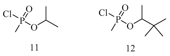 Schedule 1 list toxic chemicals which have been developed only for or used as CW. Given their toxicity and virtually no peaceful applications, they pose as a risk to the implementation of the CWC. After the terrorist events in Great Britain in 2018, Schedule 1 will receive an amendment including the “Novichok” agents, which will be entered into force in next June [48]. Compounds described in Figure 1, Figure 2, Figure 3 and Figure 4 are Schedule 1A chemicals. Examples of Schedule 1B chemicals are chlorosarin 11 and chlorosoman 12, precursors to GB 2 and GD 3, respectively (Figure 5) [3,4].