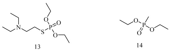 Schedule 2 contains toxic chemicals that have relevant industrial production, like the precursors for the synthesis of pesticides or medicines for example. Similar to Schedule 1, it is divided in two parts. Amiton (VG, 13), a toxic chemical related to VX (5) is an example of Schedule 2A chemical. Diethyl methylphosphonate (DEMP, 14), is an example of Schedule 2B chemical, as it can be precursor for toxic nerve agents, but also flame-retardant materials (Figure 6) [3,4].