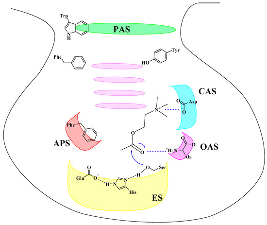 A schematic representation of different sites of AChE is shown in Figure 9 [4,8,61,62,63,64,65,66,67]. The esteratic site (catalytic site, ES), is responsible for the hydrolysis reaction through the triad serine-histidine-glutamate (whose position in the enzyme primary structure may slightly vary across species, as cholinesterases are much conserved enzymes). Also relevant is the peripheral anionic site (PAS) which is formed by aromatic amino acid residues. There are studies correlating PAS and the occurrence of β-amyloid proteins (Aβ 1–42). These insoluble oligopeptides together with tau tangles are related to the onset of AD. PAS and its aromatic region assist cationic (or electrophilic) substrates to take the right direction towards the catalytic gorge. The catalytic anionic site (CAS) contains aromatic amino acid residues, like tryptophan and phenylalanine, which interacts with the cationic motif of the substrates, and helps to bring the ester motif of substrates close to the catalytic ES. The oxyanion pocket (OAS) helps to stabilize the tetrahedral transition state (28) during ACh hydrolysis. Finally, the acyl pocket site (APS) is the point where the difference between AChE and BChE may be assessed, with AChE having a smaller APS than BChE, determining the size of the substrate to be hydrolyzed [61,62,63,64,65,66,67,85,86,87,88,89,90,91,92,93].