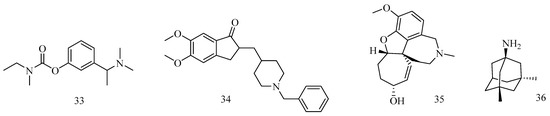 Currently, there are only four drugs available to ameliorate the memory loss and other symptoms related to AD. Nonetheless, they can only act in a certain level of impairment and are unable to halt the progression of the pathology. Consequently, knowledge on the different mechanisms that can contribute to the onset of AD and discover of the early neurological, biochemical, and behavioral changes, useful for the development of a more efficient treatments. Three of these compounds act as AChE inhibitors, rivastigmine (a carbamate, 33), donepezil (a benzylpiperidine derivative, 34), and galantamine (an alkaloid of natural occurrence, 35). The fourth compound is memantine (an adamantane derivative, 36), which affects other receptors (glutamatergic, serotoninergic, acetylcholine nicotinic receptors) [107,108,109,110,111,112,113,114,115,116,117,118,119,120,121,122,123,124,125,126,127]. These compounds are shown in Figure 10.