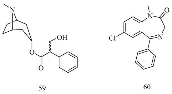 Marketed kits also contain atropine 59 as anticholinergic agent, and an anticonvulsant, such as diazepam 60 (Figure 15). Seizures may be related to the excitotoxicity that takes place due to unbalanced levels of glutamate and γ-aminobutyric acid (GABA) in brain in the course of AChE inhibition. The use of glutamate antagonists and GABA agonists may be a valuable therapeutic approach [4,194,195,196,197].