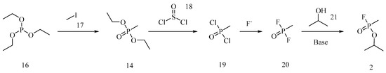 Although synthetic relationships are not the criteria for the Schedule Chemicals, Scheme 1 illustrates a possible synthetic route for GB 2, a Schedule 1A chemical, from triethyl phosphite 16, a Schedule 3B chemical. Michaelis-Arbuzov reaction of 16 with iodomethane 17 affords DEMP (14, Schedule 2B chemical). DEMP may be then chlorinated using thionyl chloride 18, a Schedule 3B chemical, yielding methylphosphonyl dichloride (MPDC, 19), another Schedule 2B chemical. MPDC is then reacted with a source of fluoride, generating methylphosphonyl difluoride (MPDF, 20), also a Schedule 2B chemical. Reaction of MPDF with isopropanol 21 in presence of a base, affords the toxic Schedule 1 chemical. There is comprehensive literature on the synthesis of organophosphorus compounds and researchers must read carefully the CWC, in the OPCW website (www.opcw.org) to learn more on the international legislation [1,2,3,4,69,70,71,72,73].