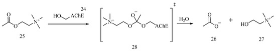 AChE 24 catalyzes the breakdown of acetylcholine (ACh, 25), into acetate 26 and choline 27 through a tetrahedral transition state 28 at the post-synaptic cleft, ending the action potential, in accordance with the proposal below (Scheme 2).