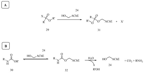 Proposed reactions between AChE and inhibitors are represented in the Scheme 3. Inhibitors have an electrophilic site that reacts with the nucleophilic hydroxyl of the serine residue at the catalytic triad. The bond is then formed by displacement of a leaving group. In case of irreversible AChE inhibitors, like classic nerve agents (G- and V-Series), organophosphorus compounds 29, the leaving group is either a halogen (fluoride in GB 2 and GD 3) or other suitable entity (cyanide in GA 4, Scheme 3A). In the case of carbamates of clinical use 30, usually reversible AChE inhibitors (exemption given to the toxic pesticides and “Novichok” carbamates described previously in this text), an alcohol 31 is displaced (Scheme 3B).