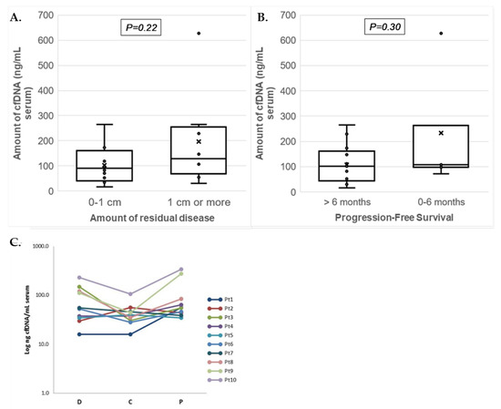 Serum cfDNA yields isolated from patients with advanced ovarian cancer. Boxplots presenting (a) amounts of cfDNA (ng/mL of serum) isolated at diagnosis for patients in relation to residual disease (RD; no or less than 1 cm vs. 1 cm or more) and (b) progression-free survival (PFS; ≤6 months and >6 months). The individual measurements are shown as dots, the mean by the cross (x), and median as horizontal line within the box. The cfDNA amounts between the groups of patients were not significantly different. (c) Graph showing the Log cfDNA concentration (ng/mL of serum) isolated from 10 patients at three different time points. Data points correspond to total cfDNA yields per mL serum for each patient (Pt) at the three different time points from serum collection: At diagnosis (D), after chemotherapy (C), and at disease progression (P).