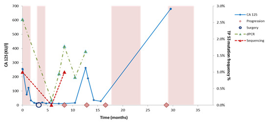 Monitoring cfDNA and CA125 levels over time in patient 5. Disease monitoring by CA125 levels and TP53 mutation (p.K132R) levels determined by NGS and digital PCR in patient 5. The colored boxes indicate time on treatment with chemotherapy. The graphs show the change in CA 125 (KU/l) levels and TP53 mutant allele frequencies (VAF %) in serial serum samples. The somatic mutations were measured using dPCR and Ion Torrent Sequencing. The timeline (in months) is indicated on the x-axis, the allele frequency of the identified mutations is represented on the right y-axis, while the CA 125 level is indicated on the left y-axis. The recolored boxes depict the times on treatment with chemotherapy. Surgery is indicated with a blue circle while clinical observed disease progression is depicted with a pink rhombus.