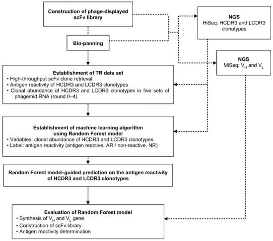 In this study, we established a phage-displayed chicken scFv library after immunization with recombinant c-Met. Four rounds of bio-panning were performed on antigen-conjugated magnetic beads. Through bio-panning, five sets of phagemid DNA (rounds 0–4) were obtained and subjected to NGS analysis using both HiSeq and MiSeq platforms. After the final round of bio-panning, scFv-displayed phage clones were obtained in a high-throughput manner using TR technology, and individual clone reactivity was evaluated by phage enzyme-linked immunosorbent assay (ELISA). From NGS data obtained using the HiSeq platform, HCDR3, and light chain complementarity region 3 (LCDR3) clonotypes were extracted and evaluated for their clonal abundance in phagemid DNA sets from round 0 (before biopanning) to round 4. We then established a data set (TR data set) containing the antigen reactivity of scFv clones retrieved through TR technology and the clonal abundance of their HCDR3 and LCDR3 clonotypes in five sets of phagemid DNA. Using this TR data set, we trained our random forest (RF) machine learning algorithm to predict the binding properties of in silico HCDR3 and LCDR3 clonotypes [18,19].