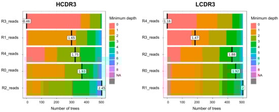 The minimum depth of a predictor variable can be interpreted as a measure of the variable importance. We extracted the minimum depth value of each predictor variable from the 500 decision trees that compromised our RF model. Of note is that, in our HCDR3 RF model, our predictor variable representing CDR3 clonal abundance in round 3 of bio-panning was most likely to appear at the root node of our decision trees appearing in 360 instances out of our 500 decision trees, and, consequently, had the lowest mean minimum depth of 0.46. In our LCDR3 RF model, our predictor variable representing CDR3 clonal abundance in round 4 of bio-panning was most likely to appear at the root node of our decision trees appearing in 195 instances out of 500 decision trees and, consequently, had the lowest minimum depth of 1.16 (Figure 2). In accordance with these observations, the Shannon entropy (SE) representing clonal diversity dropped at round 3 in the case of HCDR3 clonotypes while the SE of LCDR3 significantly dropped at round 4 (Table S6 and Figure S2).