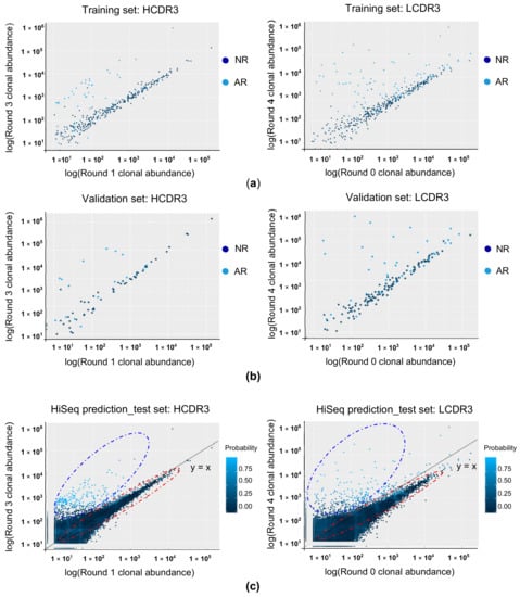 We also observed the interaction of our predictor variables taking place within the decision trees. Variable interactions are regarded as taking a sub-tree of two nodes and considering it as a single node. We can then look at the minimum depth value of that sub-tree to gauge the interaction’s importance in classifying its input. In our HCDR3 RF model, the top four most influential interactions all involved clonal abundance in round 3 of bio-panning as the root node. The most influential interaction took place between round 3 and round 1 with a minimum depth value of 0.84 (Table S7). In our LCDR3 RF model, three of the top four most influential interactions involved clonal abundance in round 4 of bio-panning as the root node. The most influential interaction took place between round 4 and round 0 with a minimum depth value of 1.18 (Table S8). Using the training data set, the clonal abundance of HCDR3 clonotype in round 3 and round 1 and that of LCDR3 clonotype in round 4 and round 0 were plotted in Figure 3a,b, which shows significant correlation.