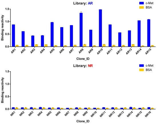 Reactivity of phage-displayed scFv clones in phage ELISA. Binding reactivity of 15 unique clones identified from the AR library and 16 unique clones from the NR library are shown. Wells in microtiter plates were either coated with recombinant mouse c-Met or just blocked with 3% BSA in PBS. Phage clones, HRP-conjugated anti-M13 antibody, and HRP substrate solution were added sequentially with intermittent washing.