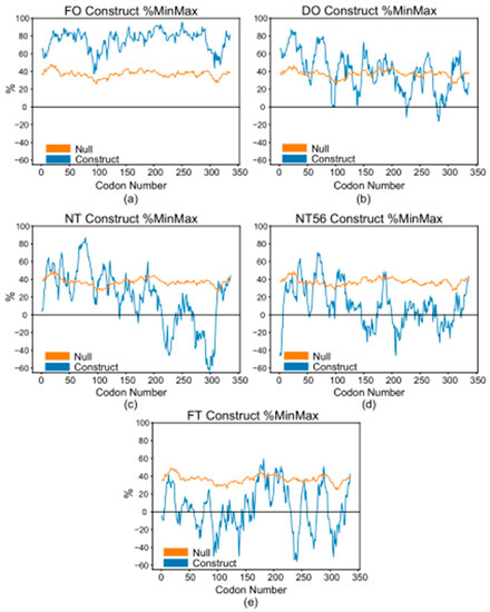 Figure 2. %MinMax values by codon position for (a) FO; (b) DO; (c) NT; (d) NT56; and (e) FT constructs. Blue indicates construct values. Orange indicates the random reverse transcription null model. Negative values (%Min) correspond to clusters of rarer codons. Positive values correspond to clusters of more optimized codons. 0% represents the average of all the possible codon choices for the construct. %MinMax values were generated with the %MinMax algorithm and plotted with Python [30].
