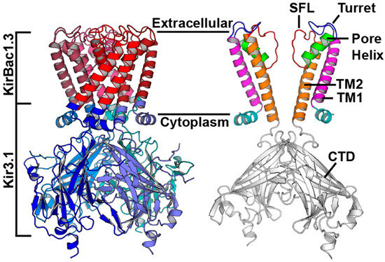 24. Nishida, M.; Cadene, M.; Chait, B.T.; MacKinnon, R. Crystal structure of a Kir3.1-prokaryotic Kir channel chimera. Embo J. 2007, 26, 4005–4015. [Google Scholar] [CrossRef] [PubMed]