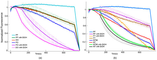 Figure 6. Fluorescent K+ flux coupled assay of (a) FO and DO constructs and (b) NT, NT56, and FT constructs using protein free (PF) liposomes with and without ethanol (EtOH) as negatives controls. Liposome composition for all samples was 1:1 PE:PS with 0.5% PIP2. Loss of fluorescent signal corresponds to K+ flux, showing all constructs are functionally active. Maximum flux is determined through addition of valinomycin.