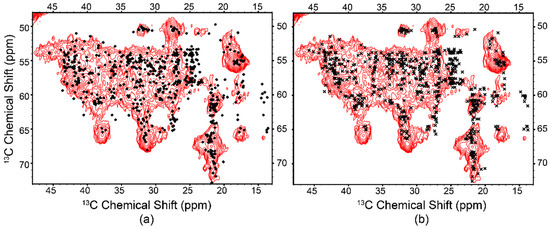 Figure 7. Cα-Aliphatic region of the 13C-13C DARR correlation spectrum of the GIRK chimera reconstituted into 1:1 brain PE:PS, overlaid with chemical shifts predicted from (a) the crystal structure (circles) and (b) the relaxed crystal structure (crosses, PDB ID: 2QKS) [24]. The crystal structure was relaxed into a 1:1 PE:PS lipid bilayer with GROMACS, with chemical shifts for both structures predicted with SHIFTX2 [45,50]. The spectrum is indicative of a folded protein with abundant secondary structure.