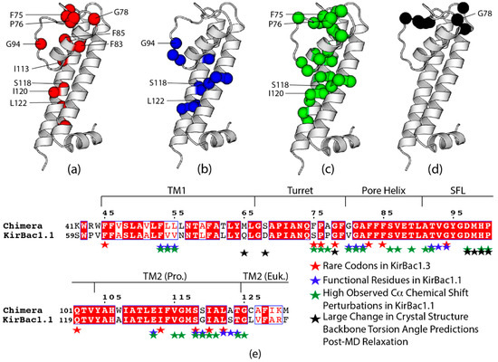 Figure 9. Visualization of chimera prokaryotic sequence analysis with crystal structure numbering conventions, comparing: (a) rare codons in red, labeled residues cluster in conformational hotspots; (b) functional residues in blue, labeled residues are rare codons; (c) chimera residues homologous to those with large observed CSPs in response to the inactive to active conformational transition, labeled residues are rare codons; (d) residues with large changes in predicted backbone torsion angles after Molecular Dynamics-based relaxation, labeled residues are rare codons; and (e) alignment of the prokaryotic region of the chimera with KirBac1.1, color-coded with observed residues in a-d (stars). In (e), solid red boxes indicate the same residue while red lettering with white background indicates similar residues monomeric structures in (ad) were obtained from the crystal structure (PDB ID: 2QKS) prepared in PyMol and formatting in (e) was adopted from the ESPRipt 3.0 output format [24,34].