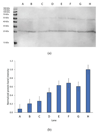 Comparison of hAQP2 expression under different growth conditions. (a) Western blot monitoring of hAQP2 expression under different induction conditions. The marker used was a Promega pre-stained protein ladder. All samples were grown in 25 mL of BMD media overnight at 30 °C prior to induction. lanes: A. Induction in 100 mL of BMM; B. Induction in 100 mL of BMM with 0.5 g/L sorbitol; C. Induction in 25 mL of BMM; D. Induction in 25 mL of BMM with 0.05 g/L sorbitol; E. Induction in 25 mL of BMM with 0.1 g/L sorbitol; F. Induction in 25 mL of BMM with 0.5 g/L sorbitol; G. Induction in 25 mL of BMM with 1 g/L sorbitol; H. Induction in 25 mL of BMM, at 20.5 °C with 0.5 g/L sorbitol. All cell pellets were broken in the same volume of breaking buffer. Membranes were centrifuged at 13,000 x g and the supernatant was removed. Membranes were incubated with 200 µL of 10% (w/v) SDS for 10 min at 65 °C, centrifuged again and 20 µL of the supernatant was loaded on a gel. The gel was transferred to a PVDF membrane by iBLOT (Invitrogen) and protein was detected by TMB substrate using the one-hour Western kit (GenScript) using mouse monoclonal 6xHis epitope-tag antibody (ThermoFisher). (b) Relative band intensity from the Western blot with LT-SEVIN (lane H) as the standard as estimated using GelAnalyzer for both the bands at 27 and 55 kDa. Band intensity was multiplied by 4 for lanes C through H to normalize for an induction volume of 100 mL of BMM to mimic the large-scale protocol.
