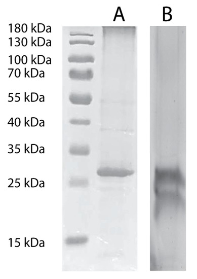 SDS-PAGE of purified hAQP2 as produced from 1.5 L cultures in (A) LT-SEVIN and (B) SEVIN growth protocols. The marker used was a Promega pre-stained protein ladder. Purified protein was concentrated to 2 mg/mL and 5 µL (A) or 10 µL (B) was incubated for 10 min at 65 °C with 5X SDS-PAGE loading dye (10% (w/v) SDS, 500 mM DTT, 50% (w/v) glycerol, 250 mM Tris-HCL, pH 6.8, and 0.5% (w/v) bromophenol blue dye). Samples were run at 110 V for 90 min, and bands were visualized with Coomassie Blue G-250 (Bio-Rad).