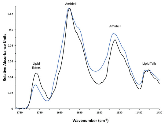 FTIR spectra of hAQP2 reconstituted into heart polar lipids at the target protein/lipid ratio of 2:1 (w/w). hAQP2 expression in P. pastoris was induced at 30 °C (blue trace) and at 20.5 °C (black trace). Characteristic bands are labeled.