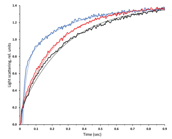 Kinetics of light scattering changes in PC/PS liposomes under hypertonic shock produced in the stopped-flow apparatus. Proteoliposomes reconstituted with hAQP2 at a protein:lipid ratio of 10:1 (w/w) (blue), the same proteoliposomes incubated with 0.1 mM HgCl2 (red), and PC/PS liposomes with no protein (black). Each trace is an average of 15 measurements and the exponential decay fits are displayed over the raw data (see text for details).