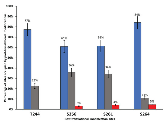 Percentage of peptides that contain post-translational modifications at T244, S256, S261, and S264 as predicted by ESI-MS of digested hAQP2. Unmodified sites are represented in blue, phosphorylated sites are black, and glycosylation sites are represented in red; 70 peptides covering the C-terminus were analyzed by ESI-MS.