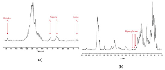 One-dimensional spectra for both 15N and 13C were collected to evaluate the quality of the hAQP2 SSNMR sample. The 1D-15N spectrum showed a good dispersion of backbone signals as well as resolved peaks for Lys, Arg, and His side-chain atoms (Figure 6a). The 1D-13C spectrum had similar resolution to the 1D-15N. However, the signals in the 70–80 ppm range are indicative of glycosylation, which is congruous with the mass spectrometry results (Figure 6b).