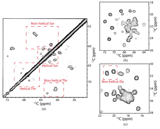Selected characteristic regions of two-dimensional 13C–13C DARR chemical shift correlation spectrum of 13C,15N-labeled hAQP2 proteolipid complexes. Regions selected to show spectral coverage of (a) Ser and Thr CA/CB correlations, (b) Thr CA/CG and Thr CB/CG correlations, and (c) Ala CA/CB correlations.