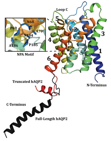 X-ray crystallographic structure of hAQP2 with major structural features identified. Helices are denoted 1–6 and loop C is indicated. Figure combines the truncated wild-type structure PDB ID 4NEF [58], and the C-terminal tail of the S256A mutant structure PDB ID 4OJ2 [95] (Black). Figure was generated in PyMOL (The PyMOL Molecular Graphics System, Version 2.0 Schrödinger, LLC ).