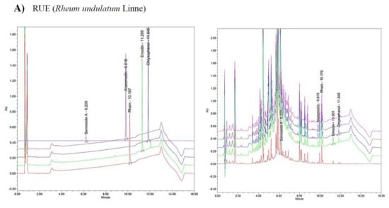 Characterization of RUE (Rheum undulatum Linne) (A) and GUE (Glycyrriza uralensis) (B) by UPLC chromatogram. (A) UPLC chromatogram of five commercial standards (left) and marker compounds in GUE (right). Each peak represents sennoside A (340 nm), emodin (254 nm), chrysophanol (254 nm), aloe-emodin (254 nm), and rhein (254 nm), respectively. (B) UPLC chromatogram of theww commercial standards (left) and marker compounds in RUE (right). Each peak represents glycyrrhizin acid (254 nm), liquiritigenin (280 nm), and isoliquiritigenin (280 nm), respectively.