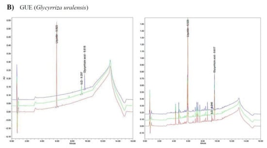- Wang, Y.C.; Yang, Y.S. Simultaneous quantification of flavonoids and triterpenoids in licorice using HPLC. J. Chromatogr. B Analyt. Technol. Biomed. Life Sci. 2007, 850, 392–399. [Google Scholar] [CrossRef]