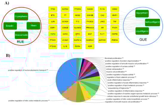Systems pharmacology-based approach. (A) Compound–target network (C–T network). The C–T network was constructed by connecting the candidate compounds (green rectangles) of R. undulatum (red circle) and G. uralensis (blue circle) with their potential targets (yellow rectangles). The C–T network was composed of 141 compound–target links generated from the connection of the 7 candidate compounds to 40 targets. (B) ClueGO analysis of the predicted targets. The pie chart represents the molecular function, immune system processes and reactome pathways of the targets identified in the network analysis. (C) Target–disease network (T–D network). In the T–D network, candidate targets were connected to the related diseases. Target proteins (40, yellow ellipses) were connected to 135 diseases (green circles), which could be assigned into 18 separated groups (orange squares).