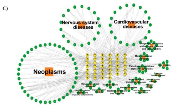All 40 of the targets were entered into pharmacology database platforms including DrugBank, Therapeutic Target, and PharmGkb to obtain a list of potentially related diseases. A total of 135 diseases, belonging to 18 groups suggested by the MeSH Browser (2017 MeSH), were identified. The target–disease interactions were visualized by using a network format (Figure 2C). Of the 135 diseases identified, 38 were found to be related to neoplasms, 17 to nervous system diseases, and 18 to cardiovascular diseases. These three disease groups are all reported to have the potential to be improved by the administration of RG.