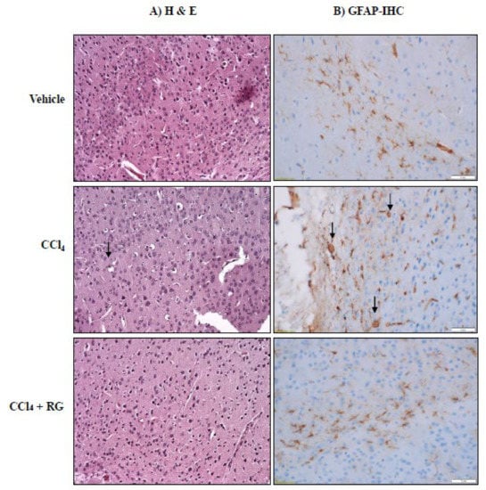 We investigated histopathological changes in the cerebral cortex by examining H&E-stained samples (Figure 4). The CCl4 treatment produced lesions in the cerebral cortex that exhibited swollen astrocytes with large vesicular nuclei and prominent nucleoli (Figure 4). However, the RG combination treatment (10 mg/kg of R plus 100 mg/kg of G) protected astrocytes in the cerebral cortex from exhibiting the lesional damages that are observed following CCl4 treatment (Figure 4A).