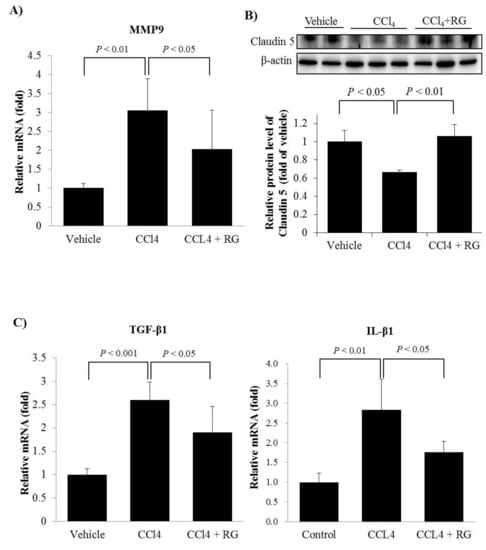The effect of RG on the CCl4-induced increase in brain endothelial cell permeability was determined by analysing MMP9 mRNA in mouse brain tissue samples. The mRNA expression of MMP9 was significantly upregulated in brain tissues of the CCl4 group, but that upregulation could be blocked by pre-treatment with RG (Figure 5A). To verify the effectiveness of RG in preventing BBB disruption, the expression of claudin-5, a tight junction protein, was assessed by undertaking an immunoblotting analysis. The level of claudin-5 was significantly decreased in the CCl4 group, compared to that in the control group (Figure 5B). However, the presence of RG led to a greater increase in the level of claudin-5 protein in the CCl4 + RG group than in the CCl4 group (Figure 5B), indicating that RG has a protective function in preventing BBB disruption.