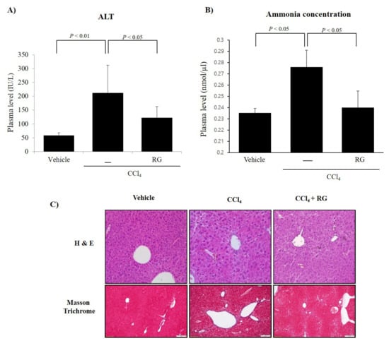 To examine the hepatic protective effects of RG, we established a chronic hepatic cirrhosis mouse model by using injections of CCl4. Repeated injections of CCl4 (5 mg/kg twice per week for 4 weeks) significantly elevated the serum ALT level, indicating that liver damage had occurred (Figure 6A). However, RG pre-treatment markedly inhibited the elevation of the serum ALT level caused by the CCl4 injections (Figure 6A). It is known that the increase of ammonia in serum is a representative indicator of hepatic encephalopathy as well as liver disease. Our results of reducing ammonia in serum increased by CCl4 with RG treatment provide further evidence that RG can mitigate live injury caused by CCl4 (Figure 6B).