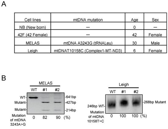 Isolation and characterization of fibroblasts from mitochondrial disease patients. (A) Overview of cell lines used in this study. (B) Heteroplasmy rate measured by restriction fragment length polymorphism (RFLP). The 3243A>G mutation was digested by Apa1, while the 10158T>C mutation was not digested by Taq1. MELAS: Mitochondrial myopathy, encephalopathy, lactic acidosis, and stroke-like episodes.