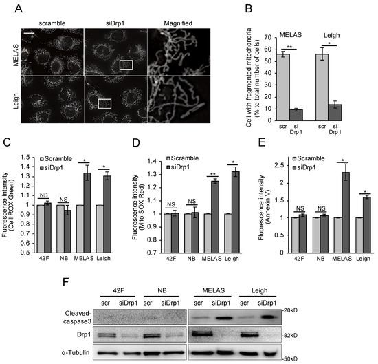 Previous studies suggested that several mitochondrial functions can be controlled by mitochondrial morphology [31,32]. However, it is not clear how mitochondrial morphology contributes to MD. To examine it in two MD fibroblasts, we first observed mitochondrial morphology by immunofluorescence using an anti-Tom20 antibody. Fragmented mitochondria are defined in Supplementary Figure S1A. Our data show that mitochondria were severely fragmented in MD fibroblasts, in contrast to the elongated mitochondria in control fibroblasts (Figure 4A,B). Mitochondrial fission depends on recruitment of Drp1 to mitochondria. We next measured intracellular Drp1 and found that it was significantly increased in MD fibroblasts compared with control fibroblasts (Figure 4C). Thus, these data indicate that mitochondria were fragmented by the mitochondrial accumulation of Drp1 in MD fibroblasts. Mitochondrial morphology is also regulated by other fission/fusion factors. We observed significant changes of several regulators of mitochondrial morphology (Supplementary Figure S1B), suggesting dramatic changes in mitochondrial morphology in MD fibroblasts. Next, we performed immunostaining to examine whether Drp1 was localized on mitochondria. Our data show that endogenous Drp1 was localized to mitochondria in MD fibroblasts, which is also consistent with a role in mitochondrial division (Figure 4D). To investigate the mechanism of Drp1 increase in MD fibroblasts, Drp1 expression levels were analyzed with real-time polymerase chain reaction and compared with Drp1 levels in control fibroblasts. Surprisingly, Drp1 showed a 200-fold increase in MELAS fibroblasts and a 100-fold increase in Leigh fibroblasts (Figure 4E), suggesting that the Drp1 protein level was increased by transcriptional regulation in MD fibroblasts.