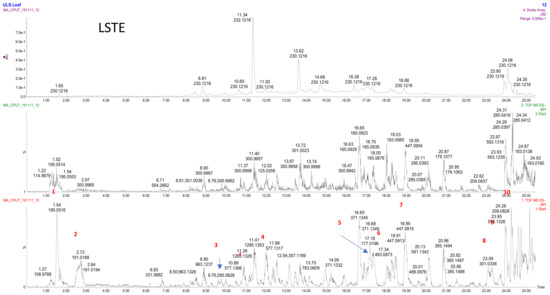 The LC–MS analysis of the LSTE (Figure 1) showed wide range of m/z (M-H) ions, which indicated the presence of different phenolic compounds including phenolic acids (ferulic (m/z 195/Rt 1.52 min)/quinic (191/2.72)/hydroxyferulic (209/24.26) and caffeic (177/17.18) acids); flavonones ((luteolin (285/9.76), quercetin (301/23.09), hyperoside (463/17.34), kaempferol galactoside (447/18.95) and kaempferol rutinoside (593/23.95)) and procyanidin dimers (577/10.89, 11.98; B type). These types of compounds have a strong ability to donate electrons and are playing a key role in the oxidation–reduction process; the removal of the electrons results in a stable quinonoidal structure (Scheme 1).