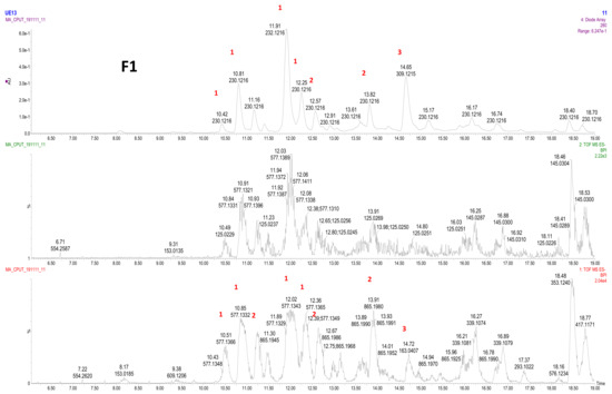 Figure 2. LC–MS profile of F1. 1: procyanidin dimer (type B); 2: procyanidin trimer (type B); 3: coumaric acid.