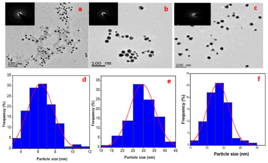 HRTEM provides information regarding morphology, crystallinity and size of nanoparticles. Figure 5a–f displayed the HRTEM results and the evaluation of particle size of LSTE, F1 and F2 Au NPs. The mean diameters of the particles were 6.3 ± 2, 24.4 ± 5 and 22.4 ± 5 nm respectively. Figure 5 shows that Au NPs were predominantly monodispersed with a spherical shape. Thick coatings could also be observed surrounding the particles, which might be extra stabilizing support from other phytochemicals in the leaf extract serving as capping agents to the hybrid nanoparticles formed. Coatings up to 5.83 nm in width surrounded particles in LSTE Au NPs and about 2.50 nm for F1 Au NPs (Figure 5b). Nevertheless, the F2 Au NPs seeds had a layer of 1.97 nm thick, mostly on the spherical particles. The approximate similar size of Au NPs conjugated with F1 and F2 can be explained in terms of the similarity in the structures and capping layers packing of F1 and F2, which (both) contain procyanidin dimers (F2) or a mixture of dimers and trimers (F1). On the other hand, the smaller size obtained by the total extract may indicate the strength of the reducing agents. It could also be due to the presence of smaller sized molecules that have the ability to perfectly shield the Au NPs. Similar coatings have been observed previously having a width between 2 and 3 nm and it was concluded that it prevents the gold nanoparticles from agglomeration [80]. Smaller particles are predominantly round-shaped, others are polygonals including traingular and some five sided shapes. On the other hand, particles with relatively larger sizes were mostly hexagonal and truncated triangular. This combination of shapes is characteristic of Au NPs and it has been associated with the different chemical constituents forming the Au NPs [81,82]. Furthermore, it is interesting to note that the mixture of shapes is common to the HRTEM results of the Au NPs but much more pronounced for F1 and F2 Au NPs. This further serves as evidence of the involvemnet of similar functional groups in forming the two particles. The inset in Figure 5a–c shows the selected area electron diffraction (SAED) pattern of LSTE, F1 and F2 Au NPs respectively. The bright circular rings indicate that the particles are polycrystalline, and can be linked to the (111), (200), (220) and (311) planes of a face-centered (FCC) structure of gold [83].