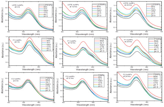 The effectiveness of nanoparticles in medical applications depends on its stability in biological solutions for a reasonable period. Figure 9 displayed the evaluation of stability when 0.5% bovine serum albumin (BSA), glycine (GLY), sodium chloride (NaCl), cysteine (CYS) and phosphate buffers at pH 7 and 9 were mixed with LSTE, F1 and F2 particles [85]. These were carried out before and after incubation at 37 °C. Even though the pH 9 solution is higher than the pH of human body fluids, it was considered to get additional information about whether nanoparticles are still stable at such a high pH. The results showed that the SPR remained the same in all the formulations. However, a noticeable shift by BSA especially from the 12th h is a behavior of certain proteins. BSA has been reported to have preference of binding to negatively charged surfaces [86]. This has been ascribed to the presence of over 50 surface lysine groups, which enable easy electrostatic interactions with negative surfaces. Consequently, the negative ZP values of our particles implies that the surfaces were largely covered by negative ions, hence more interaction with BSA. Overall, the shifts of less than 1.0 nm in all solutions was minimal, the λmax remained intact thereby affirming the stability of the particles in the solutions at the tested period.