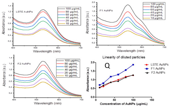 Some biomedical applications require different concentrations of gold nanoparticles. Figure 10 shows the absorbance of the hybrid (a) LSTE-, (b) F1- and (c) F2 Au NPs at different concentrations. To confirm that dilution of nanoparticles into different concentrations does not affect their stability and does not alter their physical and chemical properties in vivo, a dilution study was carried out at different concentrations of the nanoparticles (100, 80, 60, 40, 20 and 10 µg/mL), and UV-Vis spectroscopy (350–850 nm) was recorded for each concentration. From the UV-Vis spectra, the SPR wavelength had the same value for all the solutions of a given particle. This means that the dilution did not have an effect on the properties of LSTE-, F1- and F2-Au NPs, and the nanoparticles remained stable. The relationship between various concentrations of the nanoparticles and the absorbance was further examined and found to be linear. Figure 10Q shows that the intensity of absorption had linear dependence on the concentration of respective nanoparticles. This is additional evidence that the particles were stable and that they did not agglomerate even as the concentrations change.