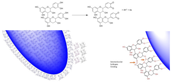LSTE, F1 and F2 were then used to successfully form Au NPs. The polyphenolic nature of these fractions makes them hydrophilic, a requirement for green synthesis. The reducing and capping ability of polyphenolics has been associated with the presence of electronegative atoms [79]. The lone pairs of electrons on oxygen further provide a suitable chelation site for binding with gold. The arrangement of certain functional groups in the structure of polyphenolics is also of great significance in their reactivity. Hydroxyl groups at adjacent positions may offer two or more binding sites, which may enhance the easy reduction of gold and subsequent capping of the particles that are formed. Oxidation reactions are common to phenolic compounds where the hydroxyl groups at ortho and para positions convert to carbonyl groups (ortho and/or para quinones). In the case of the procyanidins, the oxidation will occur at ortho positions (Scheme 1) when 4 and 6 electrons are lost for the dimer and trimer respectively. Subsequent interaction of the particles with the molecule probably brought about weak forces of attraction and encapsulation in the F1 and F2 matrix (Scheme 1). As would be discussed later, the particles are covered with negative charges providing stability and confirming the negative zeta potential values as measured by zetasizer.