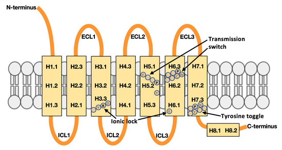 - Venkatakrishnan, A.J.; Deupi, X.; Lebon, G.; Tate, C.G.; Schertler, G.F.; Madan Babu, M. Molecular signatures of G-protein-coupled receptors. Nature 2013, 494, 185–194. [Google Scholar] [CrossRef] [PubMed]