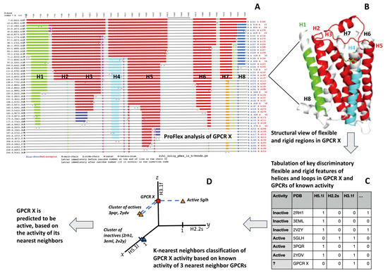 Schematic of how: (A) ProFlex results for a GPCR correspond to (B) a three-dimensional structural representation of flexibility/rigidity; (C) these flexibility/rigidity features are tabulated as discrete features for machine learning; and (D) a KNN classifier is employed with the features for activity prediction.