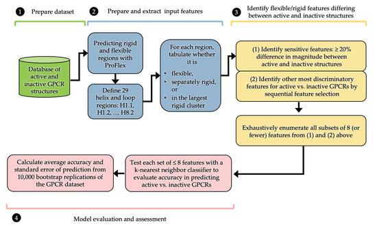 To identify characteristic flexibility features and avoid overfitting when predicting protein activity, we focused on identifying the subset of features most likely to contain useful information (Figure 3). This was done in two ways. A profile of the frequency at which each segment (e.g., H1.1) was observed by ProFlex to be flexible, separately rigid, or part of the largest rigid region in active versus inactive structures (see Section 3) was used to identify features (e.g., ECL1l) with significant differences in prevalence (at least 25%) between active and inactive GPCRs. Those features showing the greatest difference in prevalence between active and inactive structures were considered sensitive features. As a second approach, feature selection algorithms were used to identify a subset of features showing the greatest discrimination between active and inactive proteins. Here, the term feature refers to the flexibility/rigidity state of each of the 29 segments in each GPCR structure. To identify useful feature subsets, we employed sequential feature selection (SFS) followed by exhaustive feature selection [24,25].