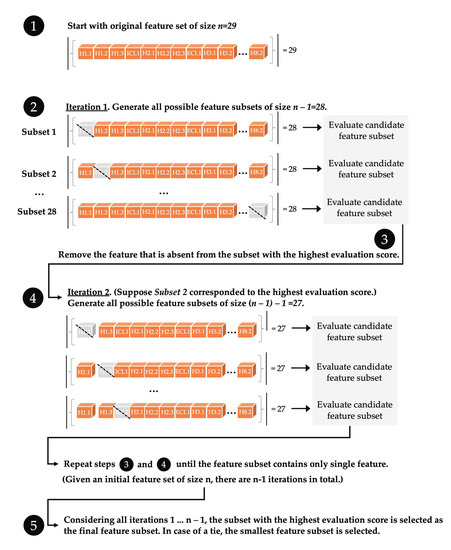 Similar to EFS, sequential feature selection (SFS) reduces the original d-dimensional feature space to a k-dimensional feature subspace, where k < d. By contrast, SFS is a greedy search paradigm that constructs feature sets in an iterative fashion guaranteed to only improve the quality of prediction, but it does not evaluate every possible feature set. SFS is a computationally manageable alternative to EFS, and in our case was used as a feature-filtering step prior to EFS. This approach reduces the feature space to focus on features with the most predictive power. SFS exists in two modes, forward and backward SFS [25]. Backward mode SFS (Figure 4) removes features from the original feature set in an iterative fashion until the new, smaller feature subspace contains a user-specified number of features. In each iteration of the selection algorithm, an objective function is to be optimized. For instance, the objective function is commonly defined as minimizing the performance difference of a predictive model before and after removing a specific feature. In each round, backward-mode SFS eliminates the feature that causes the least performance loss upon removal [24].